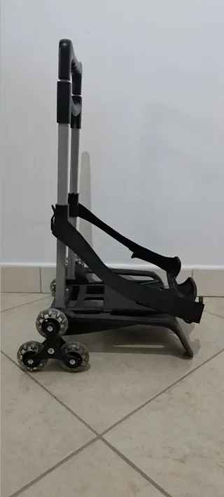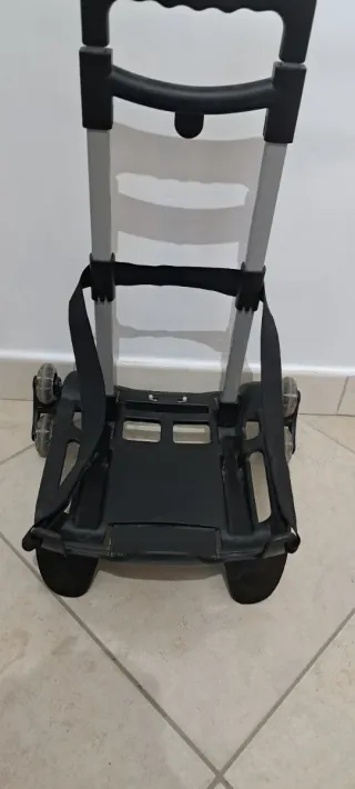Pratico porta zaino per trasportare comodamente i tuoi oggetti. - Struttura robusta in metallo e plastica. - Ruote resistenti per un facile spostamento. - Cinghie regolabili per fissare il carico.