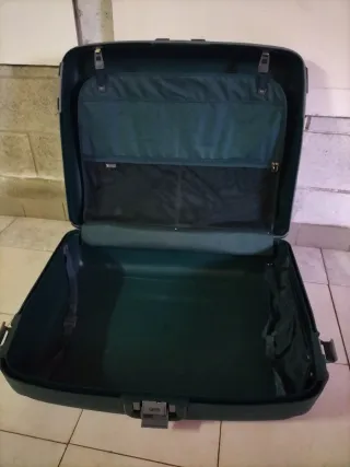 Valigia rigida di colore verde, perfetta per i tuoi viaggi. - Interno foderato in tessuto. - Cinghie elastiche per fissare i vestiti. - Tasca interna con zip. - Chiusure a scatto.