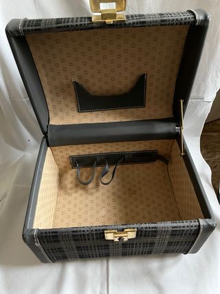 Elegante beauty case con un motivo a quadri. - Chiusura a scatto dorata. - Manico superiore rivestito. - Bordi in ecopelle grigia.