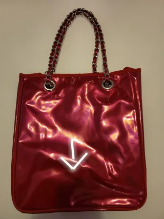 Borsa con manici a catena e finitura lucida. - Design I'm the lucky bag - Manici a catena argentati - Dettagli rossi La borsa presenta alcuni graffi nella parte frontale sopra la scritta e delle strisciate nere nella parte posteriore in basso, come indicato dalle foto. Ha due bottoni laterali che permettono di renderla più capiente se aperti.