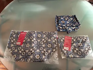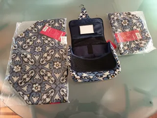 Set di borse reisenthel con un motivo decorativo. - Motivo floreale blu e bianco. - Include una trousse da appendere e due sacche.