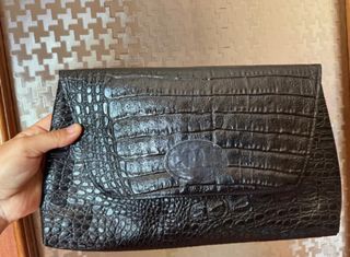 Elegante pochette vintage con una texture che ricorda la pelle di coccodrillo. - Materiale: effetto coccodrillo - Chiusura: patta - Dettaglio: ovale centrale in rilievo