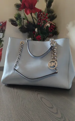 Splendida borsa Michael Kors in pelle azzurra con dettagli argento. - Manici con catena. - Charm logo MK. - Design tote capiente.