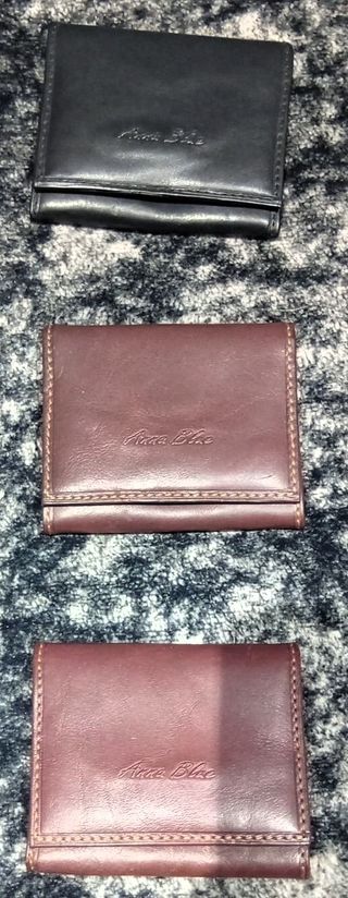 3 Porta monete in vera pelle Anna Blue nuovi mai adoperati, misura 9x8 chiusura con bottone calamita, colori due marroni e uno nero