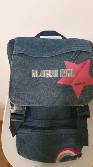 Zaino vintage Invicta con un design unico. In buone condizioni, presenti piccoli segni di usura e piccole macchie dovute all'uso - Tessuto in jeans denim. - Patch Glossy Girl con stella rosa. - Dettaglio Invicta sulla stella.
