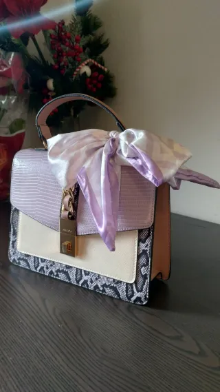 Borsa Aldo con un design a blocchi di colore e texture a contrasto. Presenta una chiusura a lucchetto dorata e un foulard decorativo legato al manico. - Texture effetto pelle di serpente sui lati. - Pannello centrale color crema. - Parte superiore in finta pelle di lucertola viola.
