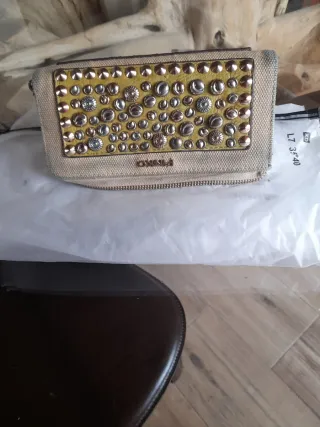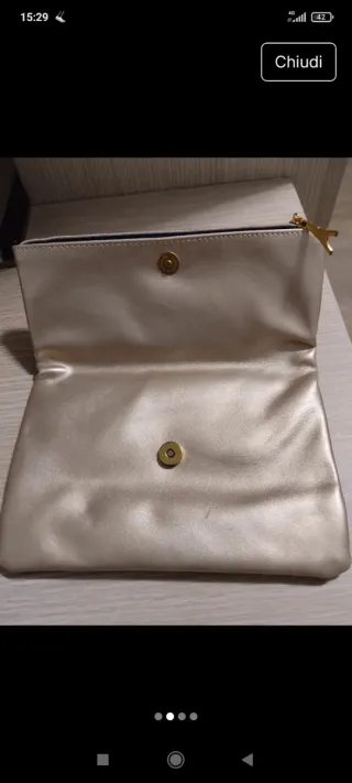 Elegante pochette blu, mai utilizzata. - Materiale effetto pelle. - Dettaglio metallico dorato sul davanti. - Include un cinturino da polso.