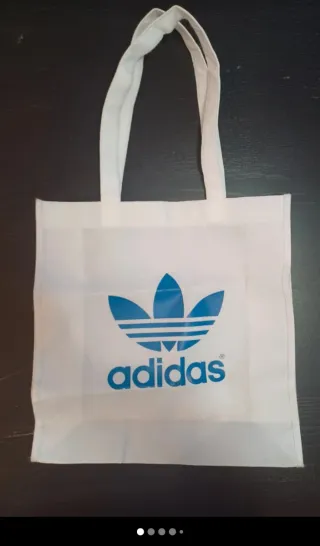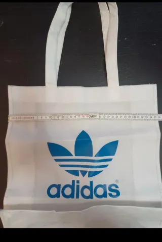 Borsa shopper in tessuto, perfetta per la spesa o per il tempo libero. - Logo Adidas a tre strisce blu sul davanti. - Manici bianchi resistenti.
