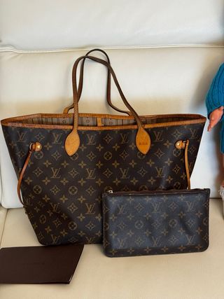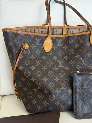 Iconica borsa Louis Vuitton Neverfull nella sua versione MM. Realizzata in tela Monogram. - Tela Monogram - Finiture in vacchetta - Fodera in tessuto - Dettagli in metallo dorato - Pochette interna rimovibile Presentava le iniziali che sono state tolte, come si può vedere in foto