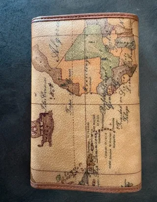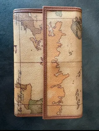 Portafoglio originale Alviero Martini Prima Classe con stampa mappa. - Design iconico con stampa mappa. - Rifiniture in pelle marrone. - Chiusura a linguetta.