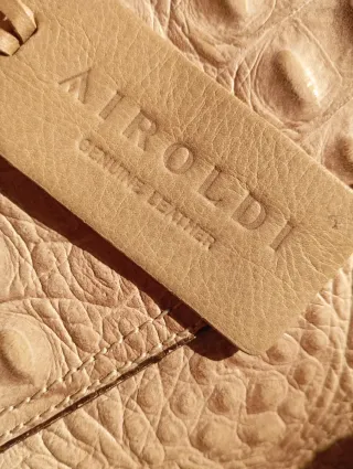 Elegante borsa a bauletto Airoldi, realizzata in pelle con finitura effetto coccodrillo. - Colore beige con sfumature marroni. - Dettagli in metallo argentato. - Manico superiore rigido.