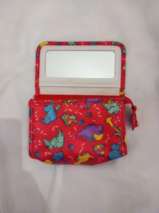 Beauty case con un simpatico disegno di dinosauri colorati su sfondo rosso. Dotato di specchietto interno. - Chiusura a zip - Tessuto resistente - Design divertente