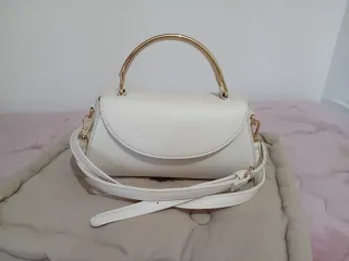 Elegante borsa bianca con dettagli dorati. Perfetta per completare ogni outfit. - Manico superiore rigido dorato. - Tracolla regolabile e rimovibile. - Chiusura a patta. - Finitura liscia.