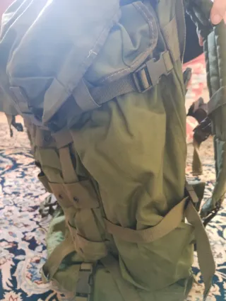 Zaino a sacco con 3 tasche (2 sul lato sinistro ed 1 sul lato destro)lo DETTAGLI TECNICI ■ Tessuto "Cordura®" colore verde oliva. ■ Dorso ad altezza regolabile su barra in poliossimetilene omopolimero con imbottitura a rete tridimensionale traspirante ■ Spallacci ergonomici imbottiti e rivestiti internamente in rete tridimensionale traspirante, facenti corpo unico con lo schienale e dotati di speciali fibbie a sgancio rapido per le attività di aviolancio ■ Pannello di irrigidimento del dorso estraibile in polietilene rinforzato con barra in alluminio modellabile (anch'essa estraibile) ■ Cintura a vita ergonomica con angolo di azion