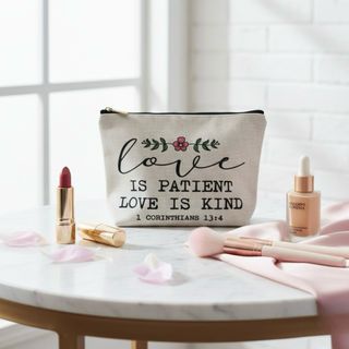 Pochette in tessuto con una bellissima stampa. - Scritta Love is Patient Love is Kind 1 Corinthians 13:4. - Dettagli floreali con fiori rosa. - Nuova, mai usata. ✨ Dimensioni: 25 x 18 x 5 cm