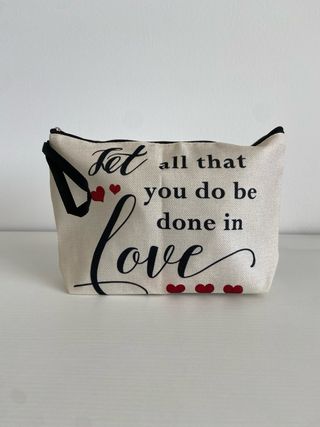 Pochette in tessuto color beige con una dolce scritta Let all that you do be done in love e cuoricini rossi. - Materiale: Tessuto - Colore: Beige e rosso ✨ Dimensioni: 25 x 18 x 5 cm