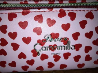 Astuccio nuovo con una graziosa fantasia di cuoricini rossi su sfondo rosa. - Chiusura con zip dorata. - Manico rosso. - Design vivace e allegro.mai usato