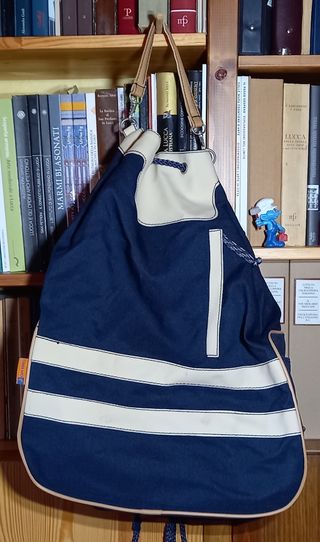 Sacca multiuso in tela blu con dettagli beige. Marca Josh'Bag, modello Cape Horn. Mai usata, pari al nuovo. Misure 34x24 h. 54 - Design a righe orizzontali. - Chiusura con coulisse e cordino blu. - Tasca esterna applicata. - Tracolle in ecopelle. - Fodera interna in tessuto.
