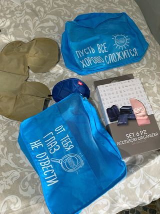 Vendo 1 set nuovo mai aperto di 6 borse per accessori da viaggio. Colore ROSA. — In piu vendo 2 borse azzurre usate misure 32 x 22 x 10 cm circa. — Piu regalo insieme cuscino gonfiabile per collo e un para occhi