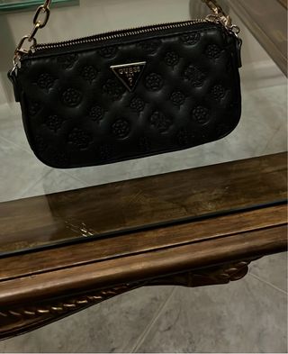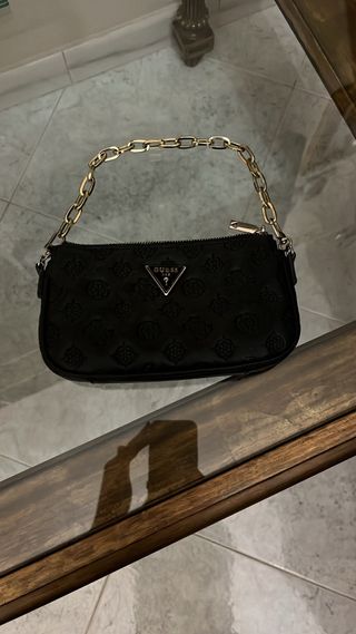 Elegante pochette Guess, perfetta per ogni occasione. Presenta un motivo monogramma tono su tono. - Colore: nero con dettagli oro. - Materiale: ecopelle. - Chiusura con zip. - Tracolla regolabile e removibile. Unico difetto punto del manico screpolato