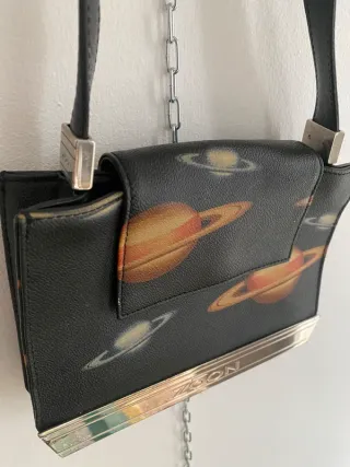 Set di due borse con una divertente fantasia di pianeti zoon - Design unico con stampa spaziale. - Dettagli metallici dorati sul fondo. - Manici neri eleganti.
