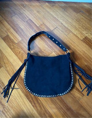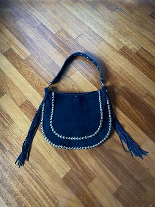 Borsa in pelle scamosciata nera con borchie in metallo dorato lucide Nuovo con custodia antipolvere Larghezza 38 cm Altezza 34 cm Doppia frangia laterale