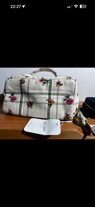 Set composto da un beauty case e un porta gioie. - Beauty case con fantasia a quadri e fiori. - Porta gioie in velluto blu piccolo