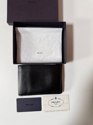 Portafogli Prada da uomo, colore nero. - Logo Prada impresso - Finitura Saffiano - Include scatola e certificato di autenticità - Con porta assegni - Leggermente usurato all’interno (il prezzo riflette lo stato) Prezzo in boutique 600€