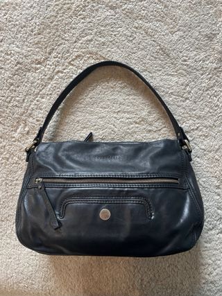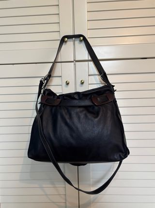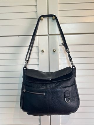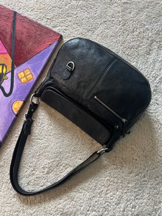 Borsa a spalla Texier in vera pelle, prodotta in Francia. - Materiale: vera pelle - Colore: nero - Dettagli con fibbia e anelli metallici - Misure: * Larghezza: 34 cm * Altezza: 29 cm * Profondità: 15 cm