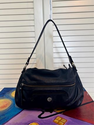 autentico pezzo vintage risalente a cavallo tra la fine degli anni '90 e i primi 2000. È realizzata in pregiata pelle martellata nera, un materiale noto per la sua qualità e resistenza nel tempo. Dettagli e Misure: * Dimensioni: 34 × 27 x 11 cm. * Hardware: Finiture argentate con l'iconico cursore ovale "Original Product Furla Since 1927", dettaglio distintivo della produzione vintage del brand. * Stato: È una borsa vintage usata molto, ma ancora perfettamente integra in ogni sua parte. * Segni di usura: Presenta lievi segni di utilizzo normale dovuti al tempo, che non ne compromettono l'estetica o la funzionalità, visibili in foto