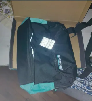 Zaino Bianchi in ottime condizioni, perfetto per l'uso quotidiano o per le attività sportive. - Design moderno e funzionale. - Dettagli in verde acqua. - Logo Bianchi ben visibile.