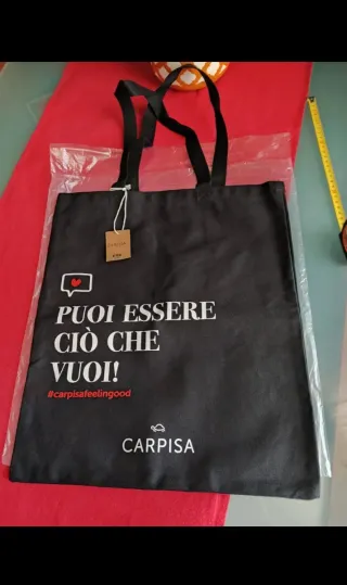 Set composto da tre borse shopping di marche diverse. - Una borsa in tela color crema con stampa verde e rosa. - Una borsa bianca con logo PRIMO EMPORIO. - Una borsa nera con scritte bianche e logo CARPISA nuova con cartellino