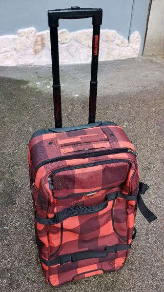 Valigia trolley Burton con un vivace motivo a quadri. - Fantasia a quadri arancio e marrone. - Design con manico telescopico e ruote per un facile trasporto. manca una ruota.