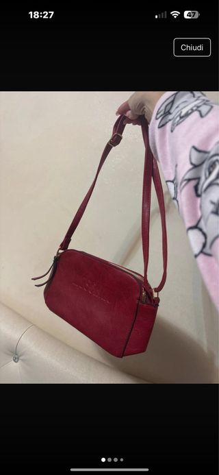 Borsa a tracolla in ecopelle, colore rosso. Design compatto e versatile. - Chiusura con zip. - Dettagli in metallo dorato. - Tracolla regolabile.