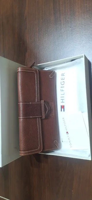Elegante portafoglio in pelle martellata. Logo Tommy Hilfiger impresso Chiusura con cinturino e bottone a pressione.