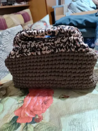 Borsetta fatta a mano con un design unico. - Materiale principale in maglia marrone. - Dettagli con fantasia leopardata. - Manici comodi per il trasporto.