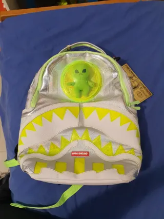 Zaino Sprayground con un simpatico alieno verde. - Design unico con dettagli a squame di squalo. - Finitura argentata brillante. - Dettagli in verde fluo.