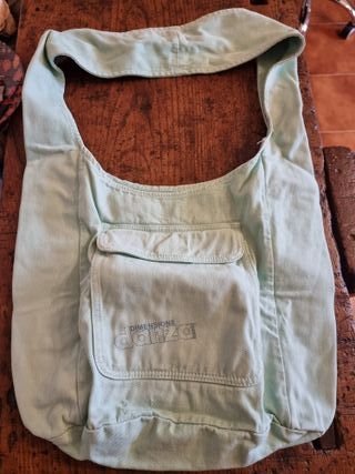 Borsa a tracolla in tessuto verde chiaro, firmata DIMENSIONE danza. Design casual e funzionale. Ampia tasca frontale con patta, chiusura in velcro, e comoda tracolla larga. Tessuto morbido e resistente, con cuciture ben rifinite. In ottime condizioni, pulita e senza difetti. Ideale per scuola, tempo libero o come borsa da viaggio leggera.