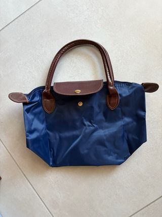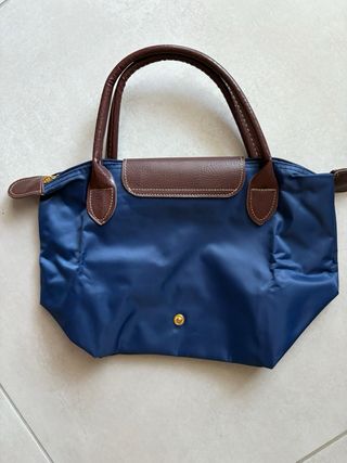 Borsa tote blu con zip e manici marroni