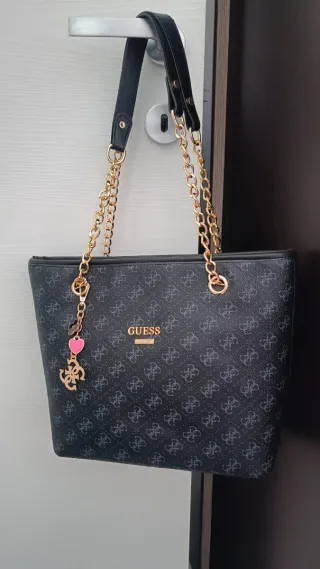 Elegante borsa Guess con un motivo monogramma all-over. I manici e le catene dorate aggiungono un tocco di lusso. - Motivo monogramma Guess. - Manici neri. - Dettagli con catena dorata. - Charm pendente con cuore rosa e ancora dorata.