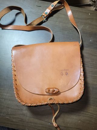 Borsetta artigianale in cuoio, con chiusura a bottone e tracolla regolabile. - Materiale: Cuoio - Dettagli: Cuciture a vista e chiusura in legno - Logo: Creazioni G.G.