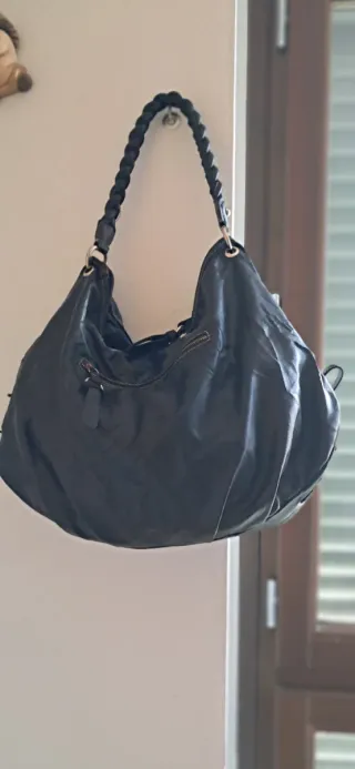 Borsa a secchiello in pelle nera, un accessorio elegante e capiente. - Materiale: vera pelle - Dettagli con cuciture a contrasto - Chiusura con girello metallico Manca una borghia visibile sulle ultime due foto