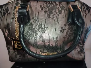 Elegante borsa a mano Laura Biagiotti, perfetta per aggiungere un tocco di classe al tuo outfit. Il design unico combina la raffinatezza del pizzo con dettagli dorati. - Motivo floreale in pizzo nero. - Manici in pelle nera. - Charm dorato con iniziale 'B' decorata con strass.