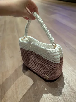 Borsa realizzata a mano all'uncinetto, bicolore con fondo piatto. Dimensioni L 24 x H 18 x P 11,5 cm - Parte inferiore in color rosa. - Parte superiore in color bianco. - Manico intrecciato e resistente. - Chiusura interna - Realizzata da me a interamente a mano