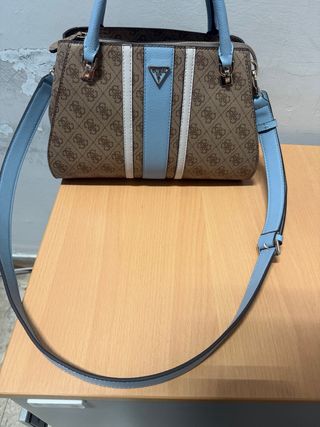Borsa Guess originale Elegante borsa Guess in tessuto monogram marrone con dettagli in ecopelle azzurra e inserti bianchi frontali. Dotata di doppi manici e tracolla regolabile e removibile, utilizzabile sia a mano che a spalla/crossbody. Chiusura con zip, interni spaziosi e ben organizzati. Dettagli metallici color argento e logo Guess frontale. Condizioni: nuovo, ancora con carta dentro (tolta per fare le foto) Colore: marrone / azzurro Stile: casual – elegante, perfetta per tutti i giorni 💼 Comoda, versatile e molto chic. Valore della borsa 155€ Con etichetta , tolta per fare la foto .