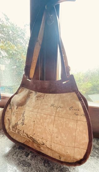 Borsa a tracolla con stampa mappa geografica. Realizzata in pelle e tessuto. - Dettagli con frange e borchie. - Chiusura con coulisse. - Tasselli decorativi con borchie.