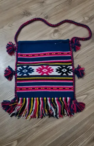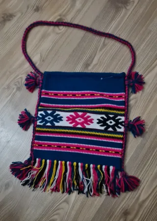 Borsa in lana lavorata a mano con un design colorato e vivace. - Decorata con motivi geometrici. - Presenta frange decorative sul fondo. - Dettagli con pompon sui lati. - Tracolla intrecciata.