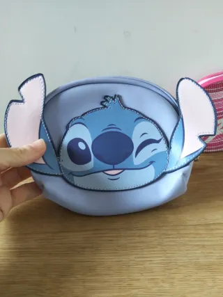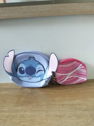 Set composto da una pochette a tema Stitch e un piccolo portamonete. - Pochette azzurra con dettagli di Stitch. - Portamonete con fantasia a righe rosa.