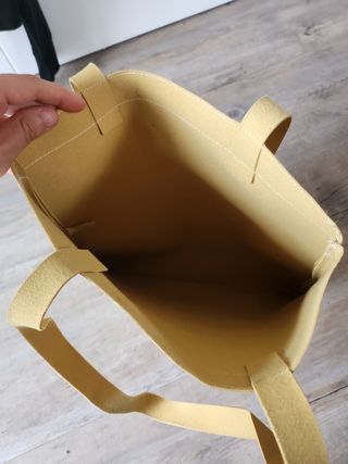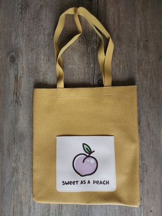 Borsa da spalla in tessuto color senape con una simpatica stampa. - Stampa Sweet as a peach con una pesca stilizzata. - Manici in tessuto. - Tasca esterna applicata con la stampa. Dimensioni: 35×32 cm