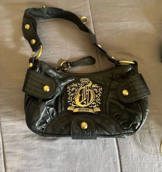 Borsa a mano vintage Guess in pelle nera. Un accessorio iconico con un design distintivo. - Logo frontale in metallo dorato con corona e iniziali. - Dettagli con borchie dorate. - Chiusura con bottone a pressione. - Tracolla regolabile con fibbie metalliche.